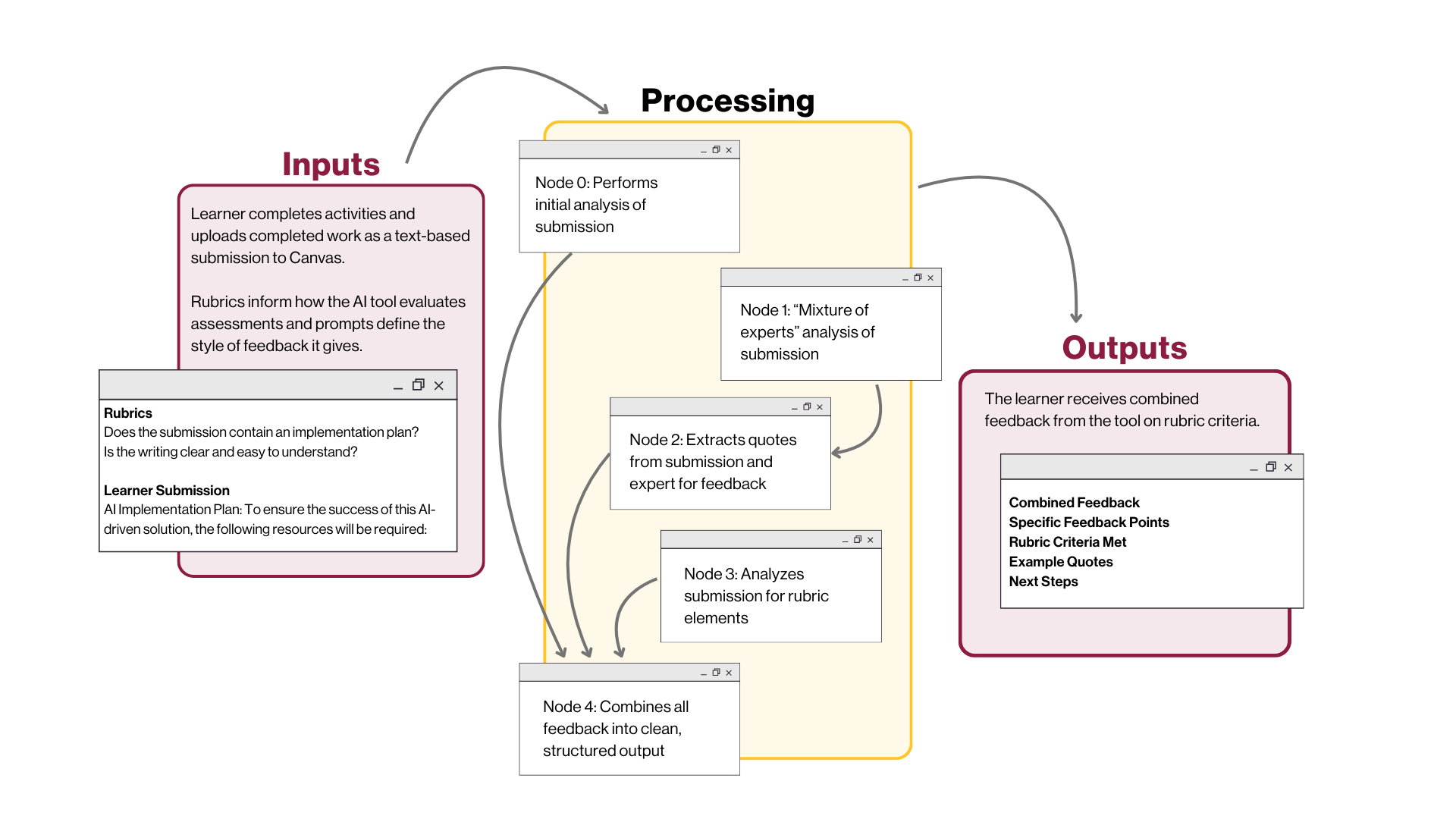 Each course was rebuilt with a clear learning arc that blends concept-building, guided practice, reflection, and applied project work. Learners engage with AI tools continuously—using them to explore ideas, generate drafts, test assumptions, and refine their thinking—while also learning how to evaluate outputs critically and ethically. To support this, I designed an AI-powered feedback grader that provides learners with immediate, structured feedback on their project work, reinforcing learning in real time and modeling how AI can support—not replace—human judgment.